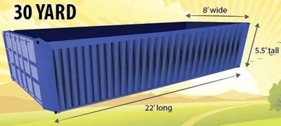 Specs: 10 yd. (L: 10′, W: 8′, H: 3’5″), 20 yd. (L: 22′, W: 8′, H: 4′), 30 yd. (L: 22′, W: 8′, H: 5.5′)
